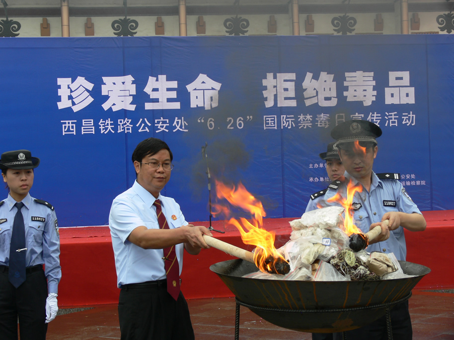 6月24日上午,西昌铁路运输法院干警身着制服,在党组书记、院长花桂荣,党组成员、副院长兼政治处主任刘成德带领下,在西昌火车站广场参加了“6.26”国际禁毒日禁毒宣传活动暨公开销毁缴获毒品活动。活动由凉山州禁毒委、成都铁路公安局主办,西昌铁路公安处、西昌铁路运输检察院、西昌铁路运输法院承办。