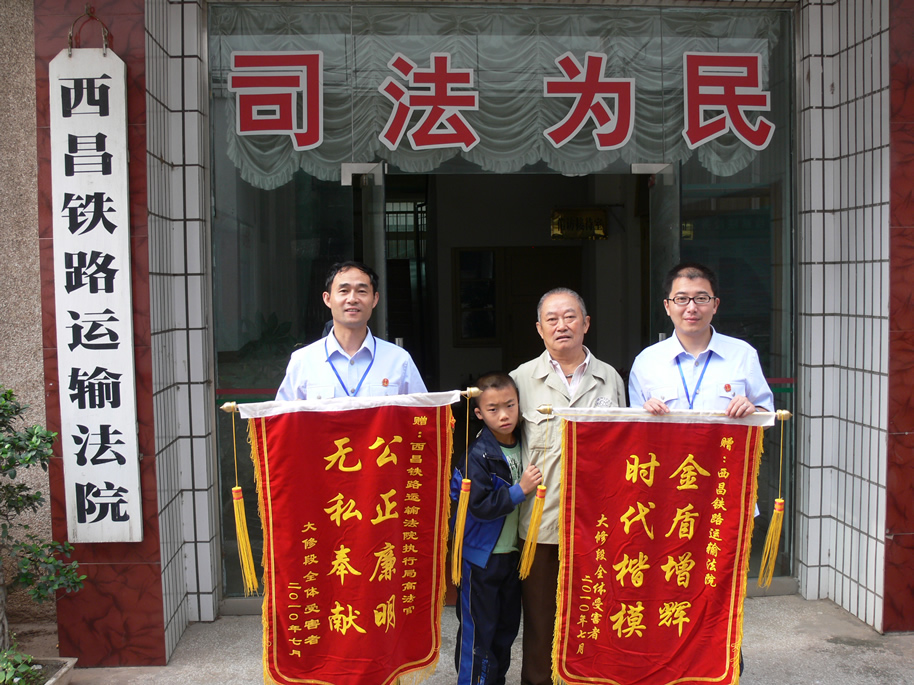 近日,西昌铁路运输法院经过两年多的艰苦努力,成功执行一起刑事诈骗罪追缴帐款和责令退赔案,为12名受害人挽回6.8万元损失。原西昌铁路大修段退休职工赵化潘代表受害人将两面绣着“金盾增辉 时代楷模”、“公正廉明 无私奉献”字样的锦旗送到法院执行局,深表感谢。