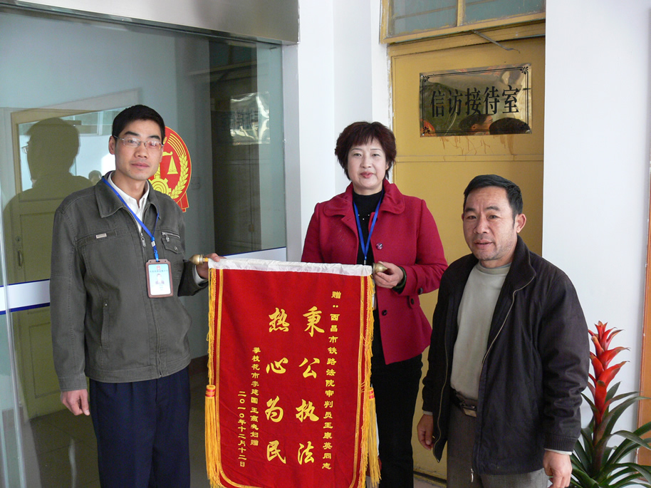案件到立案庭,立案庭法官在征得双方同意后,立即展开了诉前调解工作。通过耐心疏导,讲法析理,多次面对面调解和电话协商,双方当事人最终自愿达成由被告成都铁路局一次性补偿原告李金森13万元的调解协议,双方当事人非常满意。对铁路法院这种便民、利民、迅速化解纠纷的办案作风,原告当事人家属表示感谢,当时就送红包一个被法官拒收。回攀枝花后当事人家属又打电话说要送一面锦旗,王康英法官也婉言谢绝。2月22日上午一上班,原告父亲从攀枝花赶来,给我院立案庭法官送了一面绣有“秉公执法,热心为民”字样的锦旗。