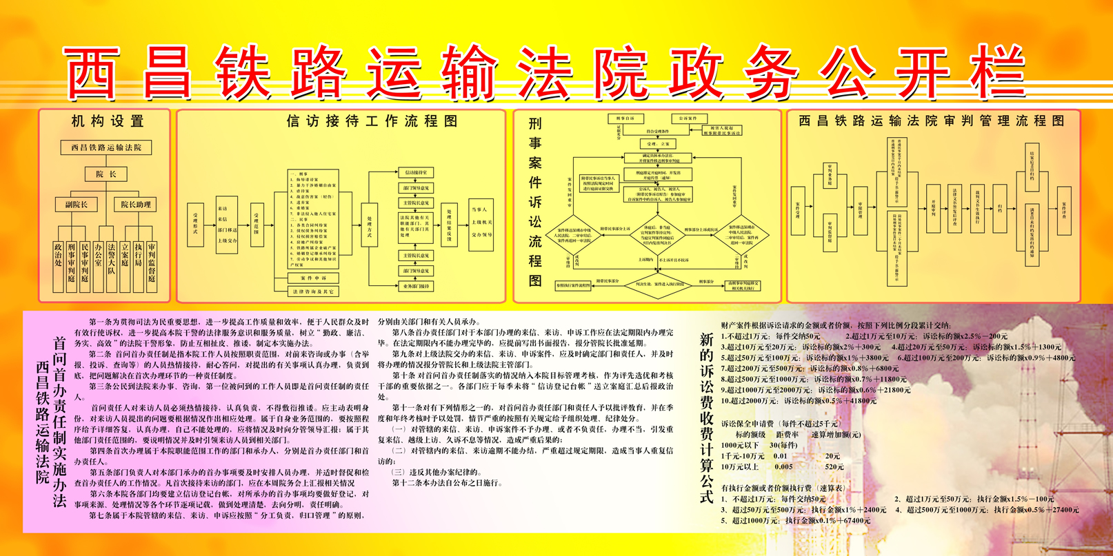 为了大力宣传党的十七大精神,全面加强审判工作和法院文化建设,近日,西昌铁路运输法院在院长的统一安排下,把格言警句、十七大工作报告有关内容精心制作成的彩色镜框和“西铁法院审务公开栏”上了墙。既增加了浓郁的法院文化氛围,又使整栋大楼面貌焕然一新,受到广大干警格外好评。