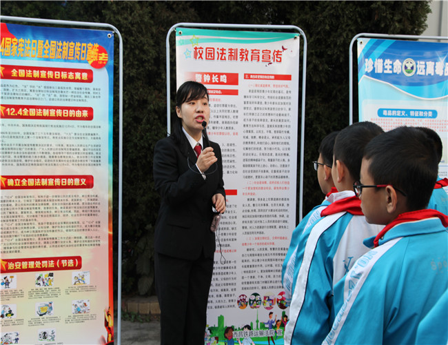 综合审判庭(未成年人案件审判庭)庭长宾伟向师生们介绍了法院的机构、性质、职能,组织学生观看漫画展板,用通俗易懂的语言,结合真实案例为学生们讲述了当前青少年违法犯罪的原因,引导学生掌握基本的法律常识,学会用法律武器保护自己。