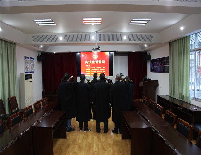 “我宣誓:忠于中华人民共和国宪法,维护宪法权威,履行法定职责……”2019年12月4日,在第六个国家宪法日,伴随着嘹亮的国歌,西铁法院组织员额法官在会议室进行了宪法宣誓。