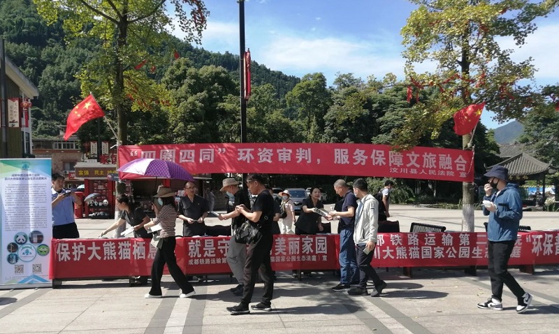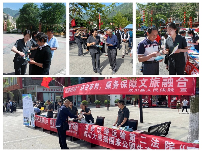 保护环境立足新增内设的四川大熊猫国家公园生态法庭职能职责,为切实增强公众的环保意识和法律意识,构筑绿色文明法治和谐的生态屏障,在第50个“世界环境日”来临之际,6月4日,我院携手汶川县人民法院,成立两支联合普法小分队,以“'四圈四同'环资审判,服务保障文旅融合”“保护大熊猫栖息地,就是守望我们美丽家园”为主题,分别在威州镇锅庄广场、映秀镇地震遗址旁开展生态环境普法宣传活动。