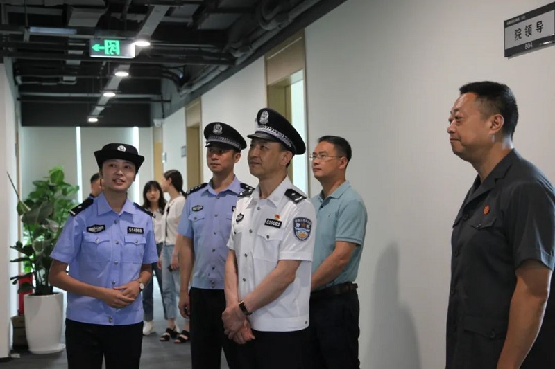 7月20日,四川省高院司法警察总队总队长刘佰利、督查科科长杨杰一行莅临成铁第二法院调研指导“六专四室”规范化建设和司法警务工作。成铁中院党组副书记、副院长李瑶,党组成员、副院长杨清明,成铁第二法院党组成员、政治部主任于泳等陪同调研。