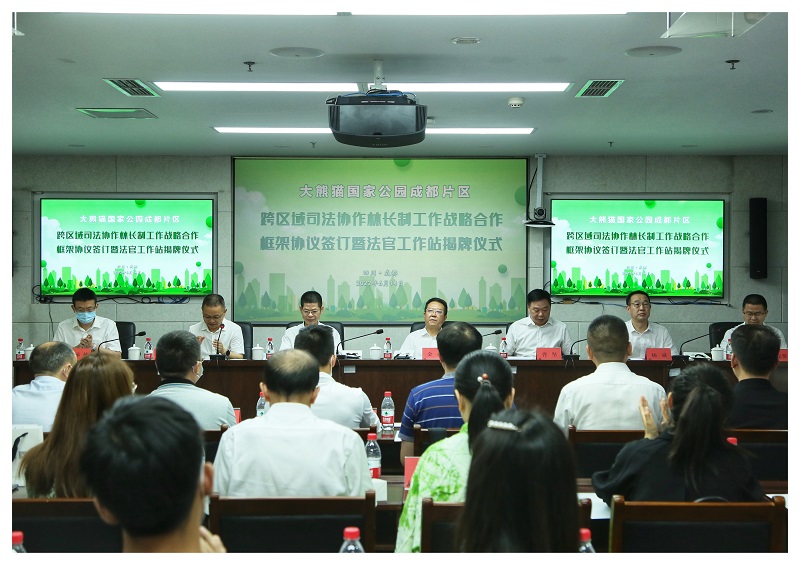 当日,在大熊猫国家公园管理局成都分局内,成都铁路运输第二法院与成都片区都江堰、大邑、崇州、彭州四地林长办及管护总站,四川省法学会环境资源法学研究会签订《大熊猫国家公园成都片区跨区域司法协作林长制工作战略合作框架协议》。