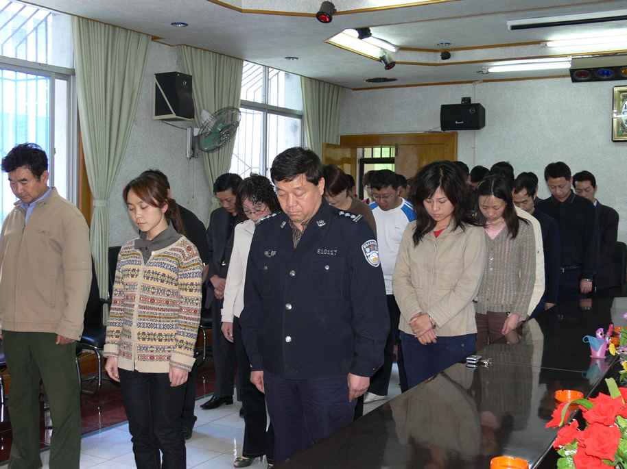 图为西昌铁路运输法院全体干警向汶川大地震遇难同胞默哀的情景。