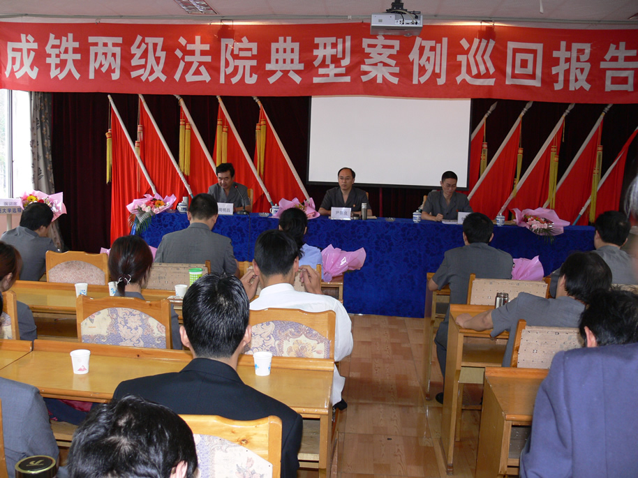 6月5日上午,成铁两级法院典型案例巡回报告会在西昌邛海技校隆重举行。此次巡回报告会是为配合深入开展“三大主题活动”,大力营造“司法为民、爱岗敬业、争创一流”精神,推动两级法院各项工作上新台阶而开展的。