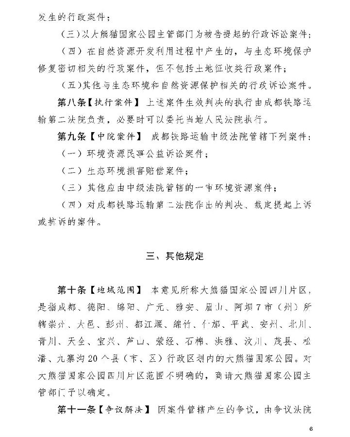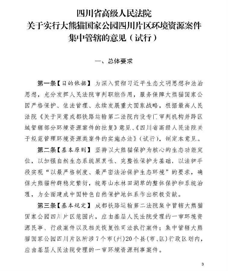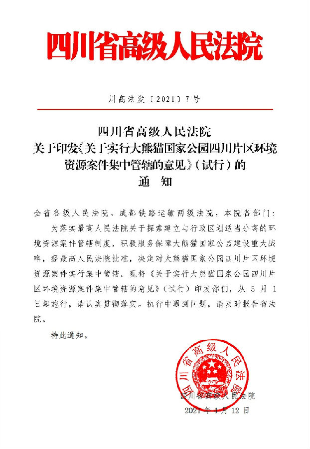 《关于实行大熊猫国家公园四川片区环境资源案件集中管辖的意见》(试行)的通知