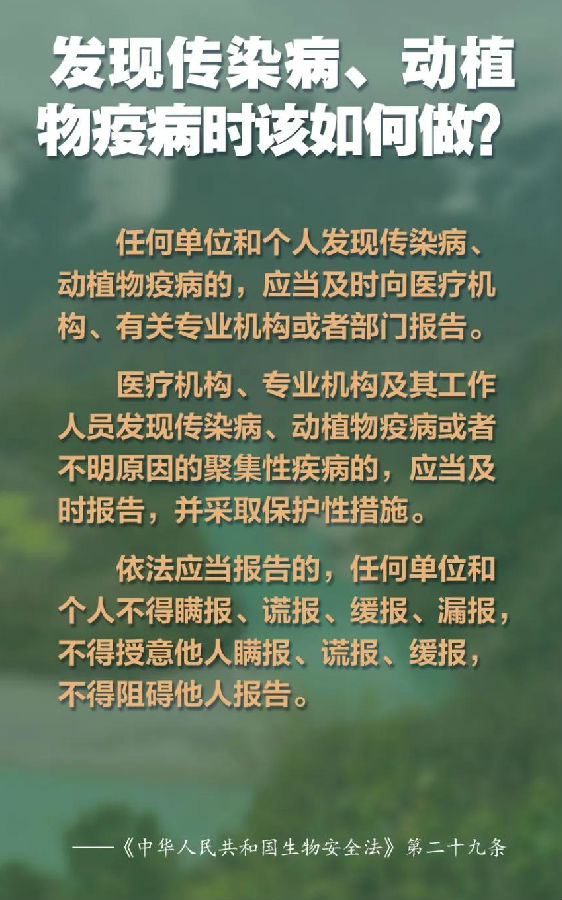 这部法律的出台,在生物安全领域形成国家生物安全战略、法律、政策“三位一体”的生物安全风险防控和治理体系,强化了防控重大传染病和动植物疫情的法律制度,集中体现“以人为本”的立法原则,让生物技术发展更好服务于国家发展、人民幸福、人类文明进步。什么是“生物安全”?发现传染病、动植物疫病时该如何做?一起来了解。