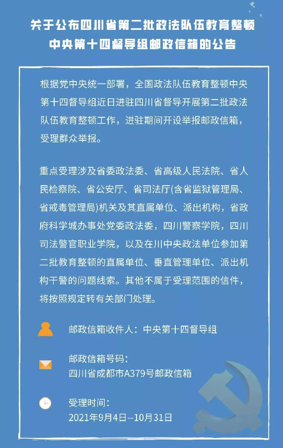 关于公布四川省第二批政法队伍教育整顿中央第十四督导组邮政信箱的公告