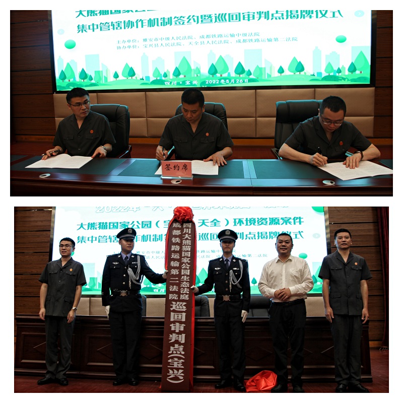 为深入践行新发展理念,协同打造四川大熊猫国家公园生态文明建设发展轴,共筑长江上游生态屏障“司法保护圈”,5月26日,在四川高院、成铁中院、雅安中院指导下,成铁二院联合宝兴法院、天全法院开展建立大熊猫国家公园环境资源案件集中管辖协作协议签约暨巡回审判点揭牌活动。这是全省设立的首个跨区域环境资源巡回审判点,也是大熊猫国家公园环资案件集中管辖后在全省签署的首份司法协作协议。
