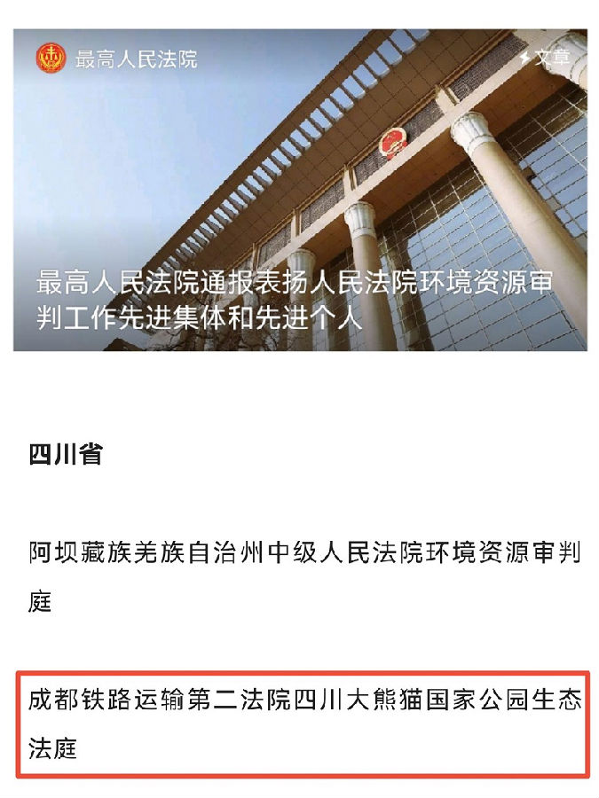 近日,最高人民法院印发《关于对人民法院环境资源审判工作先进集体和先进个人予以表扬的通报》(法〔2022〕190号),对在环境资源审判工作中表现突出的50个先进集体和100名先进个人予以表扬,四川省大熊猫国家公园生态法庭获评全国先进集体。