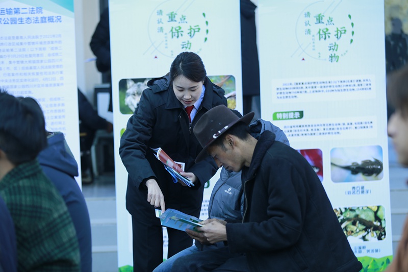 环资审判,惩罚不是目的。环资审判的最终目的就是要在全社会树立起“绿水青山就是金山银山”的理念。庭审结束后,松潘县人民法院、成铁二院联合松潘县公安局、司法局、林草局、岷江乡政府、四川省第二地区人民检察院结合案情“以案释法”,以图文并茂的形式、通俗易懂的语言,向群众宣讲相关野生动植物保护法律法规,阐述非法捕猎、滥食野生动植物涉嫌刑事犯罪的罪名和需承担的法律后果,向群众讲解野生动物保护的重要性,教育群众不捕、不吃、不买野生动物,帮助群众树立保护野生动植物的法律意识。