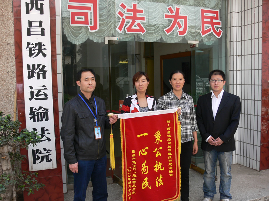 2010年4月15日下午,一阵震耳欲聋的鞭炮声打破了西昌铁路运输法院的平静。在这喜庆的鞭炮声中,两名当事人将一面“秉公执法、一心为民”的锦旗送到了西昌铁路运输法院执行局。他们紧紧握着办案法官的手,激动地说:“谢谢高法官不辞辛劳,为我们拿回了拖欠多年的欠款”。