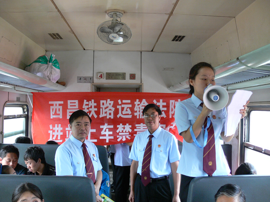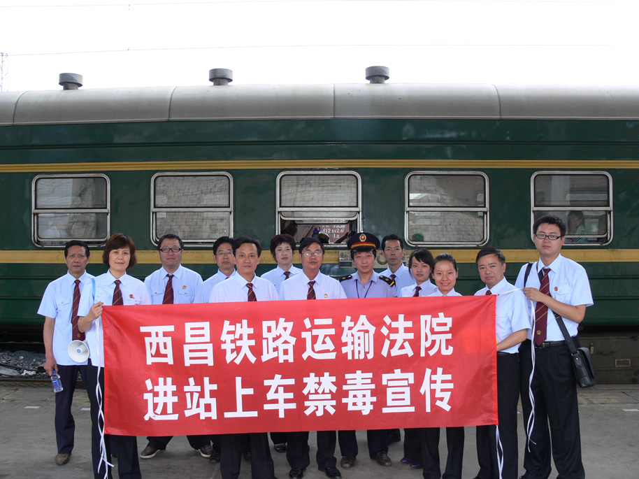 为严厉打击毒品犯罪活动,6月25日下午,西昌铁路运输法院干警身着制服,在党组书记、院长花桂荣,党组成员、副院长兼政治处主任刘成德带领下,在5634次列车上开展了“6.26”国际禁毒日禁毒宣传活动。