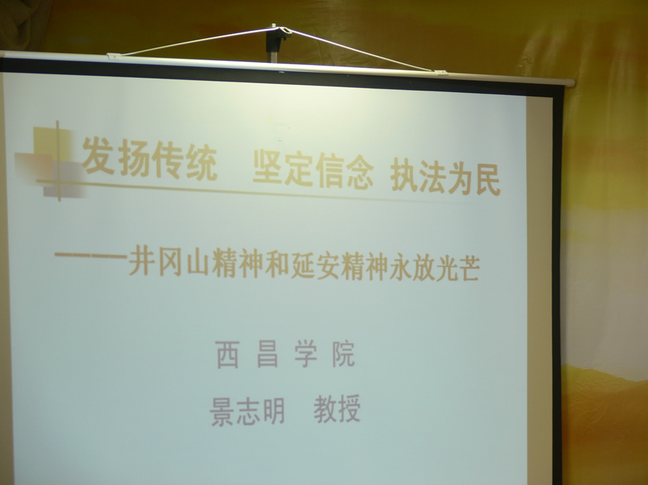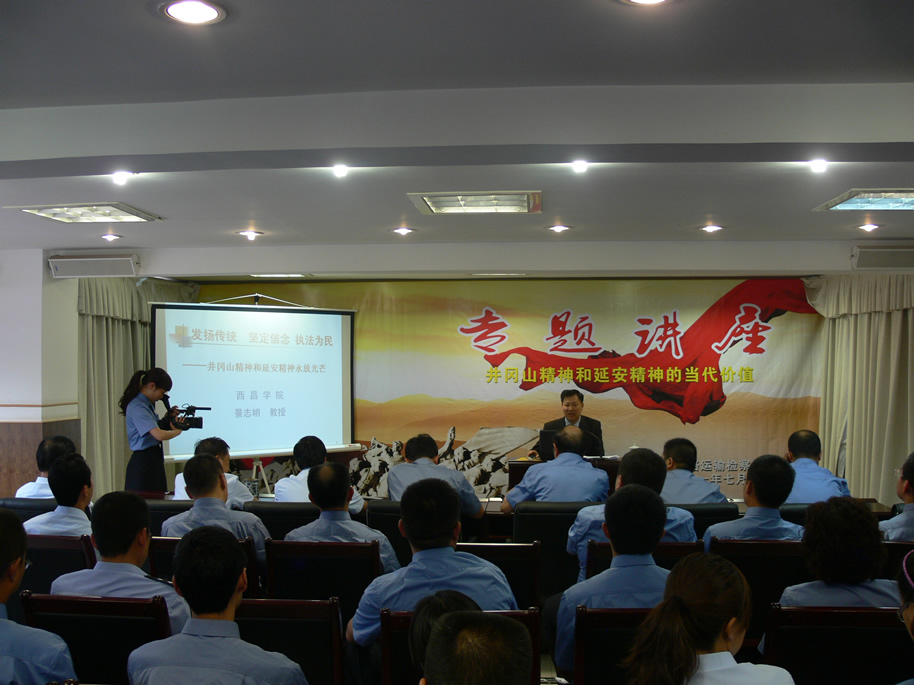 为推进“发扬传统、坚定信念、执法为民”主题教育实践活动的深入开展,进一步坚定党员领导干部的共产主义理想和中国特色社会主义信念,增强为人民意识和群众观观念,做好新形势下的人民法院各项工作,7月12日下午,西昌铁路运输法院、西昌铁路运输检察院联合举办了题为《井冈山精神和延安精神的当代价值》的专题讲座,特邀西昌学院副院长、国家二级教授景志明教授宣讲。西铁法院和西铁检察院全体干警聆听了讲座。