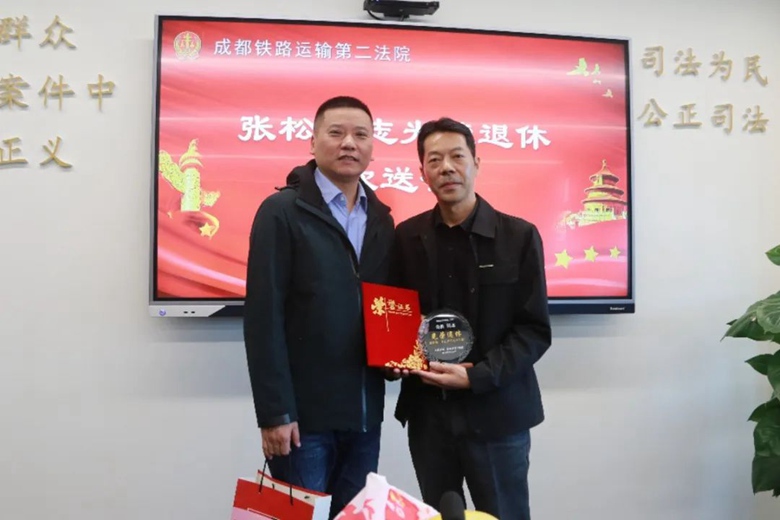 “感谢张松同志的付出,他将最宝贵的年华和最辛勤的汗水投入到成铁二院事业发展中。希望张松同志始终牢记成铁二院情怀,常回家看看,积极参与退休党支部建设工作,为法院工作高质量发展建言献策。”