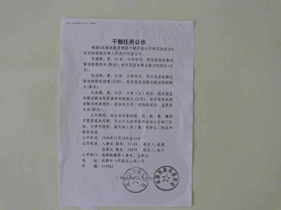 12月15日,路局人事处(党委组织部)人才交流中心何庆二人来到西铁法院考察院领导干部。在院的27名干警参加了考察工作。