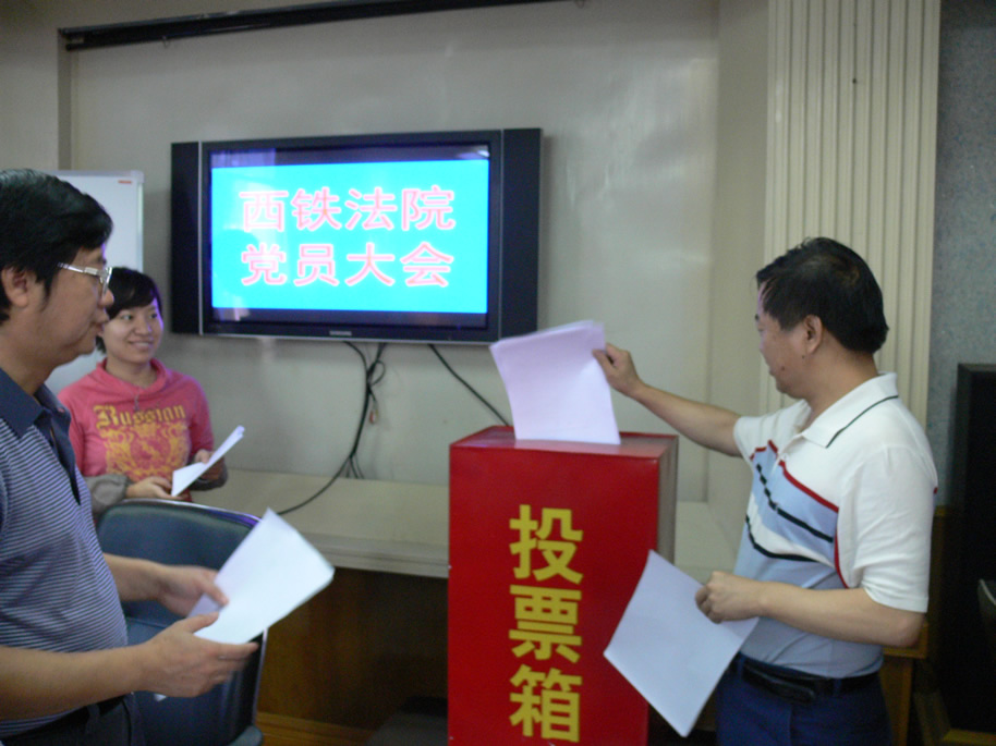 花桂荣院长首先代表上届党总支部委员会作总支工作报告,全体党员对工作报告进行了充分的讨论后,经表决一致通过,同时全体党员还讨论通过了本次改选的选举办法。本次选举由上届总支委员会和院党组共同蕴酿提出候选人名单,采用直接选举和差额选举的办法进行选举。应到会党员共31人,实际到会28人,占党员总数的91%,均为正式党员。在监票人的监督下,共发出选票28张,收回28张,其中有效票28张,由大会指定的计票人进行了计票,于泳、王康英、刘盼、刘成德、唐恩情分别以27票、24票、24票、27票、25票通过了民主选举,成为西铁法院新一届党总支部委员会委员。