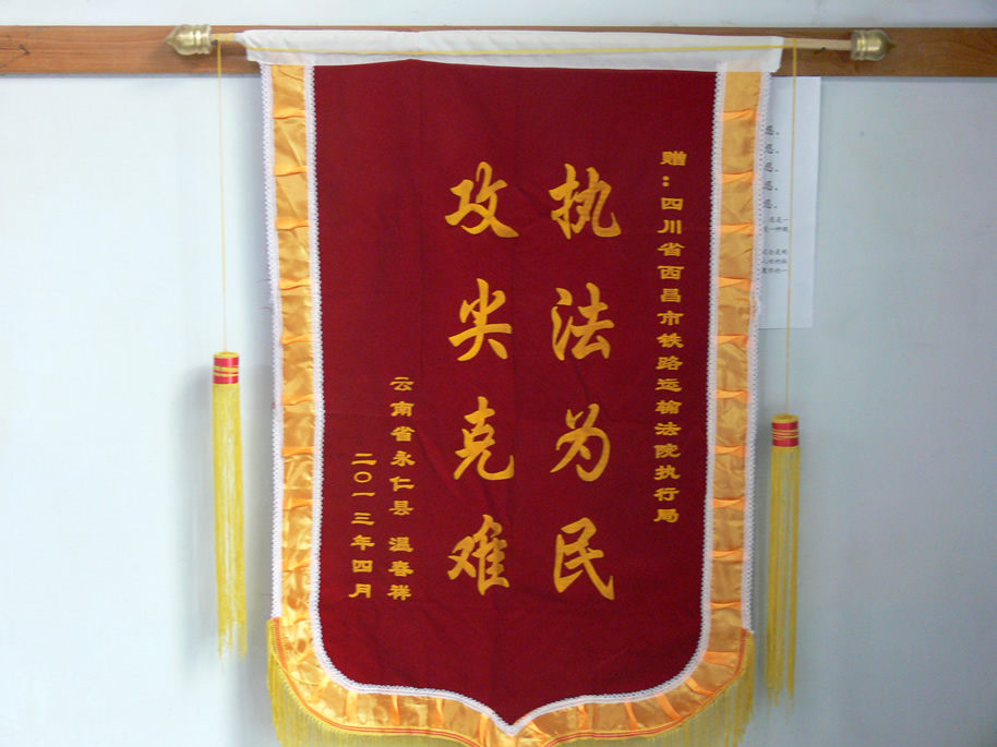 4 月12日,云南省永仁县的申请执行人温春祥将一面绣有“执法为民,攻坚克难”的锦旗寄到我院执行局,对我院六年艰辛为其执行回17838.31元赔偿款表示感谢。