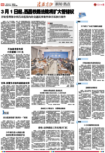 本报讯 近日,四川省高级人民法院经过深入调研,并报经最高院批复同意,于2014年12月29日下发了《关于指定在川的铁路运输法院受理民事案件和执行案件范围的规定》,该规定要求自2015年3月1日起施行,西昌铁路运输法院届时将开始受理新类型案件。
