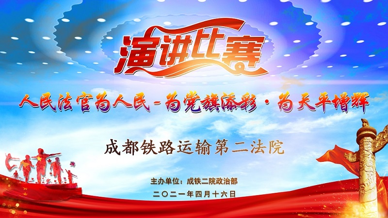 为隆重庆祝中国共产党建党100周年,结合在全党开展的党史学习教育,大力弘扬人民法官在党的领导下,坚定法治信仰,忠诚审判事业和司法为民的职业精神,4月16日,成都铁路运输第二法院举办“人民法官为人民——为党旗添彩·为天平增辉”主题演讲比赛。