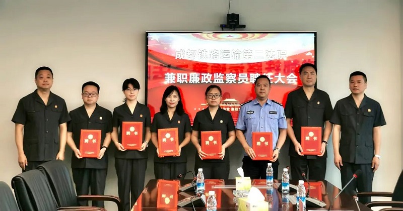 2021年5月25日,在院党组的高度重视和大力支持下,我院召开了廉政监察员聘任大会。会上,党组成员、政治部主任于泳宣读了“成都铁路运输第二法院关于聘任张福全等六名同志为廉政监察员的决定”。党组书记、院长苏青对六名廉政监察员发放了廉政监察员聘书。