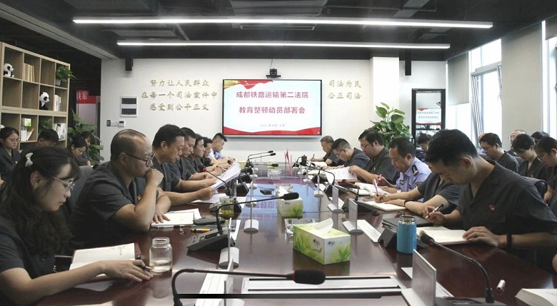 8月18日下午,成都铁路运输第二法院召开队伍教育整顿动员部署会,第一时间贯彻全国、全省和上级法院关于开展第二批政法队伍教育整顿的决策部署和相关会议精神,对本院开展队伍教育整顿进行动员部署,确保队伍教育整顿开局良好、推进有序、取得实效。全体干警(含聘用制人员)参加会议。成铁第二法院队伍教育整顿领导小组组长、院党组书记、院长苏青作动员讲话。党组成员、政治部主任、院队伍教育整顿领导小组办公室主任于泳主持会议并宣读关于调整教育整顿领导小组下设工作机构的通知。