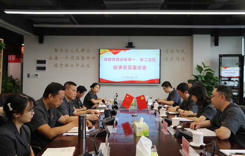 为强化政法队伍教育整顿工作走实走深,8月25日上午,成都铁路运输第一、第二法院召开征求意见座谈会。成都铁路运输第一法院党组书记、院长张艳秋,党组成员、副院长李西川,党组成员、党总支部书记杨军,党组成员、执行局局长张吉平;成都铁路运输第二法院党组书记、院长苏青,党组成员、副院长蒋兴平,党组成员、政治部主任于泳,党组成员、执行局局长张松以及相关工作负责同志参加会议。