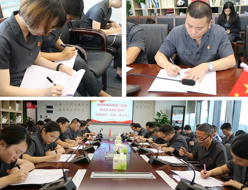 为有效推进政法队伍教育整顿扎实开展,检验干警学习情况,巩固干警学习成效,8月26日下午,成铁二院组织全院干警参加政法队伍教育整顿应知应会知识测试。