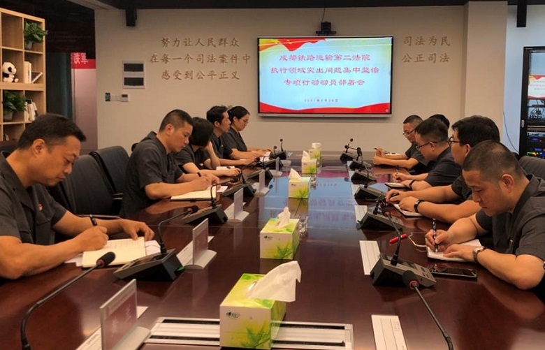 按照省院、中院统一部署,9月28日下午,成都铁路运输第二法院召开执行领域突出问题集中整治专项行动动员部署会。会议由院党组成员、政治部主任于泳主持,院党组书记、院长苏青,执行局局长张松,行装负责同志吴玮以及18年以来办理过执行案件的所有干警参加会议。