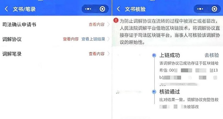 调解员根据调解方案形成调解笔录和调解协议书后推送给双方当事人,让当事人双方确认无误后,当事人利用“多元调解”小程序对调解笔录与调解协议书线上签字确认并回传。在文书签署并回传后,人民法院调解平台借助区块链技术,将调解协议直接存证于司法区块链平台,当事人及调解员可以在人民法院调解平台小程序中进行核验。