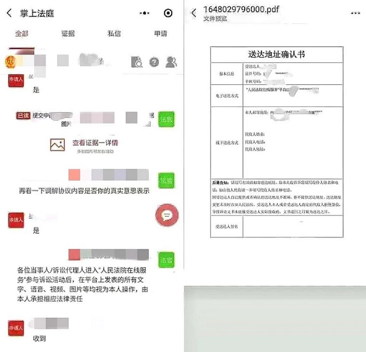 受理司法确认申请后,法院随机分案确定承办法官,承办法官组织双方当事人登录人民法院在线服务系统,通过“掌上法庭”,完成身份认证,并在线对调解协议是否违反自愿、合法原则,是否有明确的可执行内容,以及是否存在违反法律强制性规定、损害国家利益、社会公共利益、他人合法权益,或者违反公序良俗等情形等进行了审查。审查后,当事人线上签署送达地址确认书。