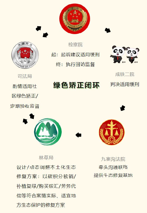 在该绿色矫正闭环中,五家单位围绕绿色矫正方案充分发挥主观能动性,在跨区域管辖、决策适用、本土化改造、监管监督上各司其职、互通有无,以取得跨区域管辖环资案件司法修复与综合治理的最大公约数。