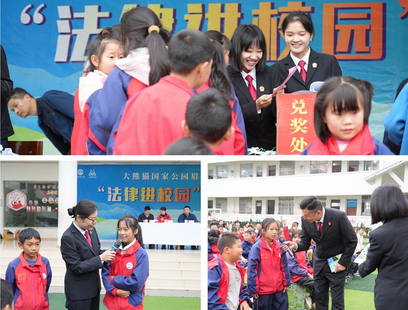 四川大熊猫国家公园生态法庭的苗发旺法官运用通俗易懂、形象生动的语言,深入浅出地向同学们普及了环境资源相关知识,在孩子们心中播下了法治与环保的种子。随后,野生动植物保护和自然教育知识竞答环节更是激发了孩子们的参与热情,现场气氛热烈而活跃。孩子们争先恐后地抢卡、答题、兑奖,将活动推向了高潮。在轻松愉快的氛围中,学生们不仅学习了法律知识,还进一步增强了法治与环保意识。